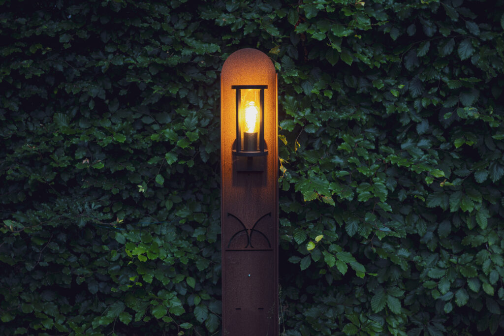 In Zuidwolde realiseerden we cortenstalen buitenlampen met subtiel verwerkt huislogo: stoer overdag, warm en sfeervol ’s avonds.